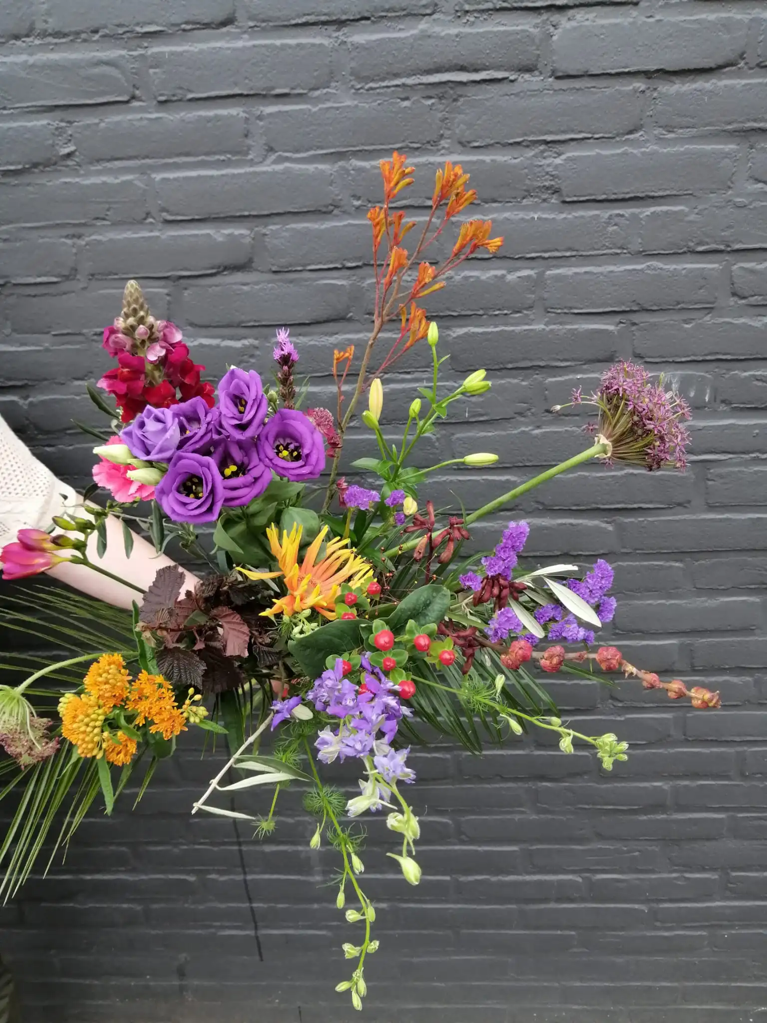 Dit fantastische boeket wordt met oranje en paarse bloemen gemaakt. Het formaat in de foto is maat L